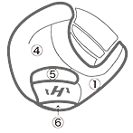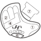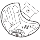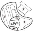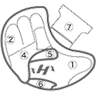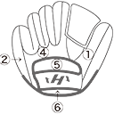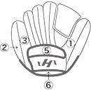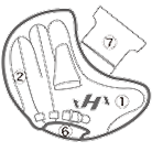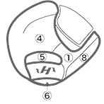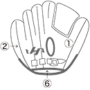 ①親指部 ②子指部(外側)③子指部(内側)④甲部 ⑤裏革(窓見部)⑥裏革(手口下部)⑦ウェブ ⑧親指部(外側)